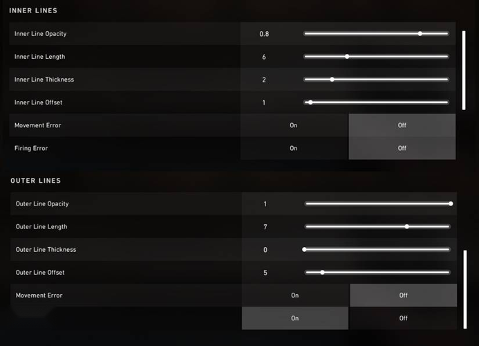 Within the crosshair customization interface, options are organized into three main categories: "General," "Inner Lines," and "Outer Lines." The Inner and Outer Lines sections let you adjust the size, thickness, and visibility of the respective crosshair components. Meanwhile, the General tab offers controls to change the crosshair's color, toggle an outline or center dot, and enable or disable the "Fade with Firing Error" feature, which dynamically adjusts the crosshair's transparency based on your shooting activity.