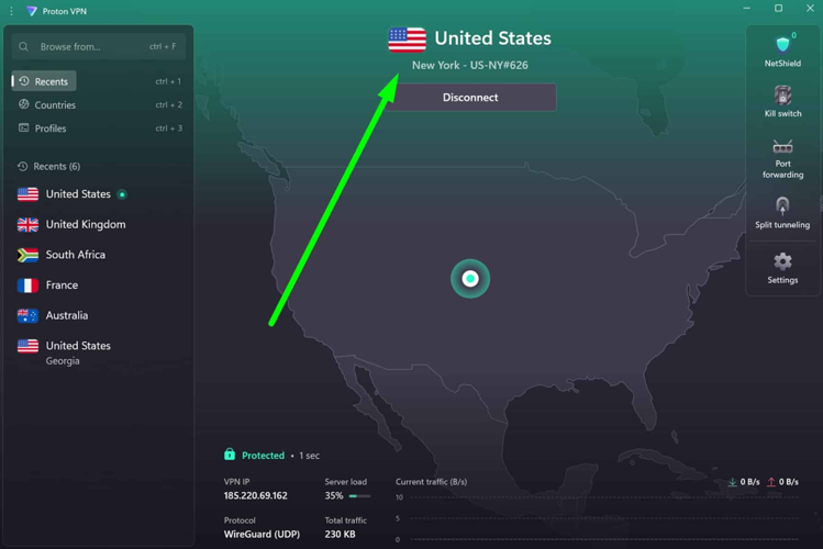 • Navigate to the server selection interface, choose a VPN server located in your desired country (e.g., United States or United Kingdom), and initiate the connection.