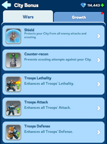 - Counter-Recon: Shields your city from enemy scouting for durations of 2, 8, or 24 hours, keeping your plans hidden.
