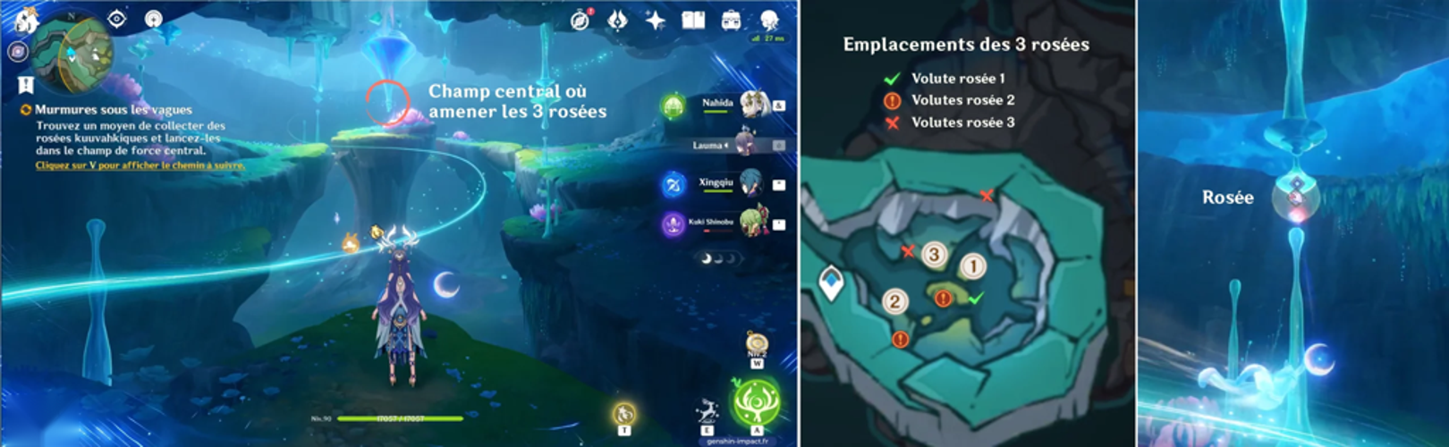 N’oubliez pas que chaque rosée ne peut apparaître qu’après avoir touché les volutes bleues situées à proximité. La carte ci-dessous indique clairement la position des rosées et des volutes associées, ce qui vous aidera à localiser ces éléments essentiels pour la suite de la quête.