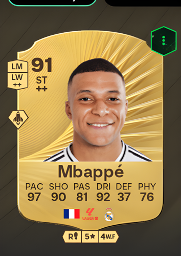 Kylian Mbappé's Gold Rare card stands out as a Striker with an impressive overall rating of 91, highlighting his elite status in the game. This card boasts a blistering pace rating of 97, making Mbappé one of the fastest attackers available, while his shooting rating of 90 ensures clinical finishing in front of goal. With a dribbling rating of 92, he can weave through defenders effortlessly, and his passing rating of 81 adds an extra dimension to his attacking play. Although his defense rating is a modest 37, his physicality rating of 76 provides enough strength to hold off challenges. As a striker, Mbappé's card offers a significant advantage for players seeking a sharp and dynamic forward who can break through opposing defenses with ease, capitalize on scoring opportunities, and turn the tide of any match.