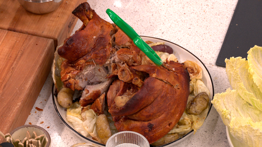 In preparing for the event, I chose to serve a classic crispy pork knuckle, but with some creative twists on the side dishes. Instead of standard potatoes, I made crispy potato pancakes to add a different texture. To replace traditional sauerkraut, I lightly spritzed fresh cabbage leaves with sauerkraut juice, giving them a tangy flavor. The plan was for our guests—Eric Wareheim and Chelsea Lazkani—to enjoy the pork wrapped in these cabbage leaves, creating a ssam or wrap, similar to Korean barbecue styles or our signature bo ssam at Momofuku.