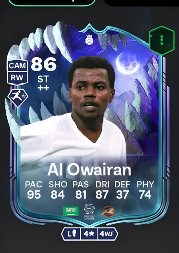 Saeed Al Owairan's Ultimate Scream Hero card is a formidable Striker, boasting an impressive overall rating of 86. With a blistering pace rating of 95, clinical shooting at 84, precise passing of 81, and exceptional dribbling skills rated at 87, this card captures the essence of a dynamic and explosive forward. The primary advantage of deploying Al Owairan in this role is his ability to function as a sharp attacking spearhead; his electrifying speed and close control allow him to rapidly tear apart the opposing team's defense, creating and seizing goal-scoring opportunities to decisively seal the deal in any match.