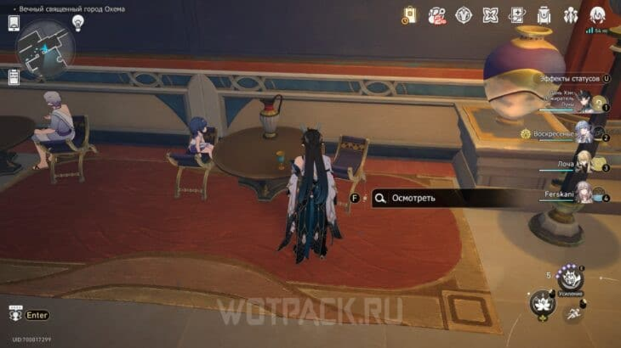 Um das Geheimnis der ewigen Heiligen Stadt Ochema zu lüften, sollten Sie den Raumanker „Hof der drei Jahreszeiten“ aktivieren. Danach betreten Sie den Korridor und nehmen in beliebiger Reihenfolge Kontakt mit den sechs Gläsern Ambrosia auf.