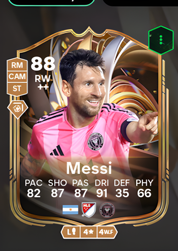 Lionel Messi's Ratings Reload card features him as a dynamic Right Wing with an impressive overall rating of 88, showcasing his exceptional prowess on the field. This card boasts standout attributes, including an outstanding dribbling rating of 91, precise passing and shooting scores of 87 each, and a swift pace rated at 82. Although his defense and physicality are rated lower at 35 and 66 respectively, Messi’s strengths as a winger make this card a valuable asset for any squad. His sharp attacking abilities allow players to quickly break through opposition defenses, create scoring opportunities, and decisively influence the outcome of matches.