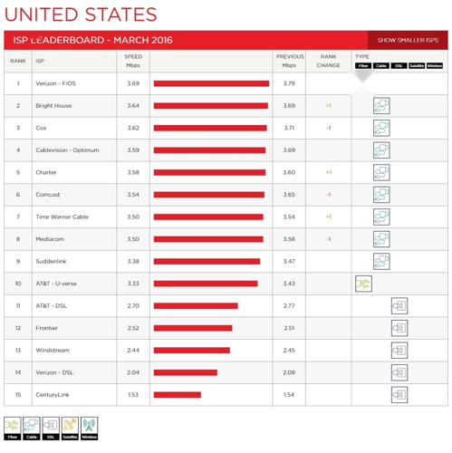 - CenturyLink, which has experienced a steady decline since November, now ranks at the bottom of the U.S. list with an average speed of 1.53 Mbps. Interestingly, Costa Rica's average speed in March was slightly higher at 1.87 Mbps, making it the slowest among tracked countries.