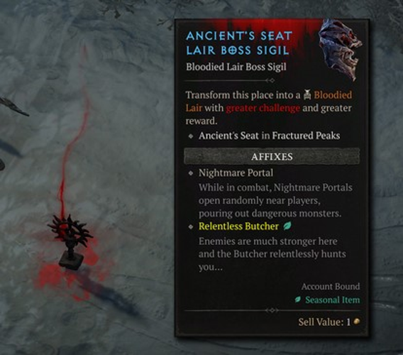 Bloodied sigils introduce a new and relentless challenge, featuring a powerful affix called the Relentless Butcher. This notorious foe relentlessly pursues you, relentlessly hunting your every move. Even if you manage to defeat him, he will immediately resurrect, never truly ceasing his pursuit.