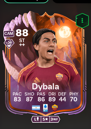Paulo Dybala's Ultimate Scream card arrives as a formidable 88-rated Striker, boasting an elite technical profile highlighted by his 89 dribbling, 87 shooting, and 86 passing. This combination of attributes makes him an exceptionally sharp and creative attacking force, perfectly suited to his central role. Operating at the tip of the attack, his superb close control and lethal finishing allow him to expertly navigate tight spaces in the final third, tear apart defensive lines with incisive runs, and clinically seize any opportunity to score the decisive goal and seal the victory.